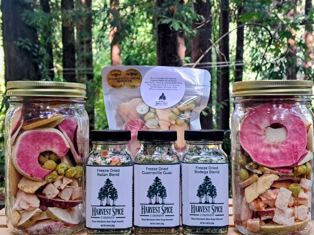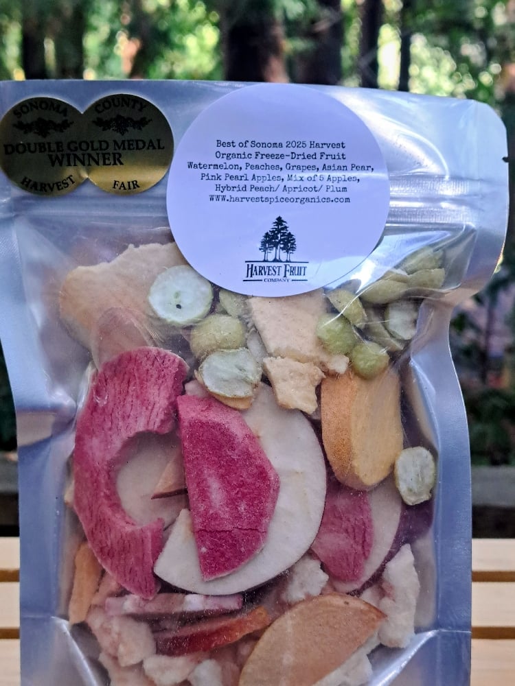 I also won Double Gold in the snack food competition for my Best Of Somoma 2025 Freeze-Dried Fruit Jars. First these quart mason jars, I tried the best of the fall Harvest, from all the best Sonoma County Organic Farms. I sourced the fruit from FEED Cooperative. I tried 20 Diffrent farms
